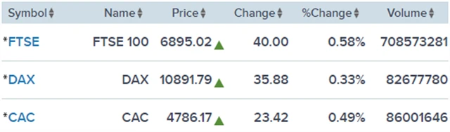 Regionální index STOXX Europe 600 stoupl o 0,35 % na 348,71 bodu, britský FTSE 100 zpevnil o 0,58 % na 6 895,02 bodu, francouzský CAC 40 si připsal 0,49 % na 4 786,17 bodu a německý DAX získal 0,33 % na 10 891,79 bodu.