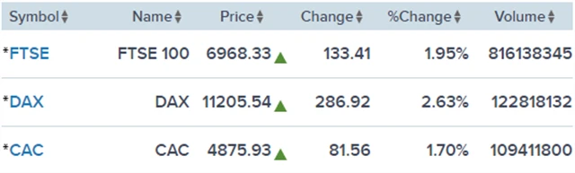Regionální index STOXX Europe 600 získal 1,8 % na 357,05 bodu, za celý týden pak vzrostl o 2,25 %. Britský FTSE 100 se zvýšil o 1,95 % na 6 968,33 bodu (týden: +0,72 %), francouzský CAC 40 zpevnil o 1,7 % na 4 875,93 bodu (týden: +1,98 %) a německý DAX posílil o 2,63 % na 11 205,54 bodu (týden: +2,92 %).