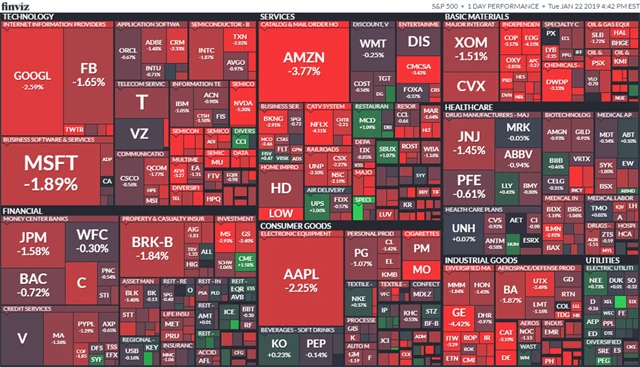 Zpomalení růstu čínské ekonomiky v úterý oslabilo akcie výrobců čipů a dolů zamířily rovněž akcie z tzv. skupiny FAANG, tedy cenné papíry Facebooku (-1,65 %), Applu (-2,24 %), Amazonu (-3,77 %) či Alphabetu (-2,59 %). Ztrácely i akcie farmaceutické a kosmetické společnosti Johnson & Johnson (-1,45 %), protože firemní výhled letošních tržeb zaostal za očekáváním analytiků.