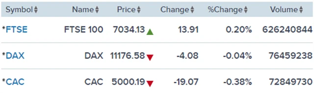 Regionální index STOXX Europe 600 stoupl o 0,06 % na 359,92 bodu, britský FTSE 100 si připsal 0,2 % na 7 034,13 bodu, francouzský CAC 40 odepsal 0,38 % na 5 000,19 bodu a německý DAX se snížil o 0,04 % na 11 176,58 bodu.