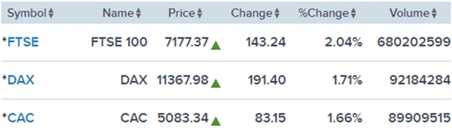 Regionální index STOXX Europe 600 získal 1,41 % na 364,99 bodu, britský FTSE 100 se zvýšil o 2,04 % na 7 177,37 bodu, francouzský CAC 40 si polepšil o 1,66 % na 5 083,34 bodu a německý DAX zpevnil o 1,71 % na 11 367,98 bodu.