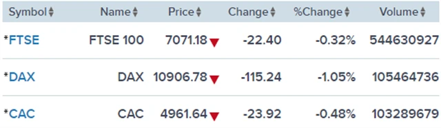 Regionální index STOXX Europe 600 odepsal 0,56 % na 358,07 bodu, za celý týden pak klesl o 0,46 %. Britský FTSE 100 se snížil o 0,32 % na 7 071,18 bodu (týden: +0,73 %), francouzský CAC 40 klesl o 0,48 % na 4 961,64 bodu (týden: -1,15 %) a německý DAX odevzdal 1,05 % na 10 906,78 bodu (týden: -2,45 %).