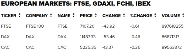 Regionální index STOXX Europe 600 odepsal 0,28 % na 372,58 bodu, britský FTSE 100 přišel o 0,61 % na 7 107,2 bodu, francouzský CAC 40 klesl o 0,26 % na 5 225,35 bodu a německý DAX ztratil 0,46 % na 11 487,33 bodu.
