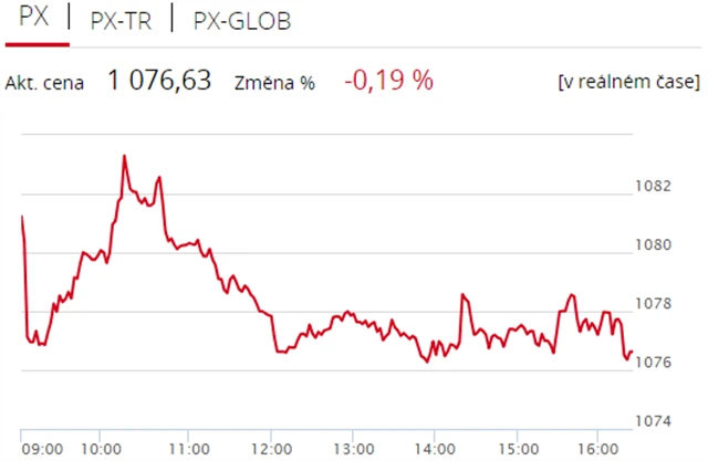 Pražská burza v úterý nenavázala na pondělní růst, index PX ztratil 0,19 % na 1 076,63 bodu. Dolů burzu stáhly zejména akcie společnosti ČEZ a Komerční banky, dařilo se naopak Kofole ČeskoSlovensko. Objem obchodů byl s necelými 520 miliony korun byl mírně podprůměrný.