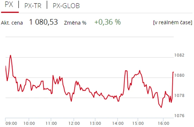 Pražská burza se ve středu odrazila od ztráty z úterního obchodování, index PX si připsal 0,36 % na 1 080,53 bodu. Nahoru burzu táhly zejména akcie Komerční banky, proti trendu však šla Erste Group Bank. Objem obchodů byl s necelými 539 miliony korun průměrný.