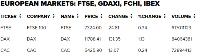 Regionální index STOXX Europe 600 se zvýšil o 0,57 % na 384,24 bodu, britský FTSE 100 stoupl o 0,34 % na 7 324 bodů, francouzský CAC 40 získal 0,24 % na 5 425,9 bodu a německý DAX posílil o 1,13 % na 11 788,41 bodu.