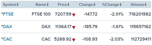 Regionální index STOXX Europe 600 odepsal 1,22 % na 376,03 bodu, za celý týden pak ztratil 1,33 %. Britský FTSE 100 klesl o 2,01 % na 7 207,59 bodu (týden: -0,29 %), francouzský CAC 40 oslabil o 2,03 % na 5 269,92 bodu (týden: -2,5 %) a německý DAX se snížil o 1,61 % na 11 364,17 bodu (týden: -2,75 %).