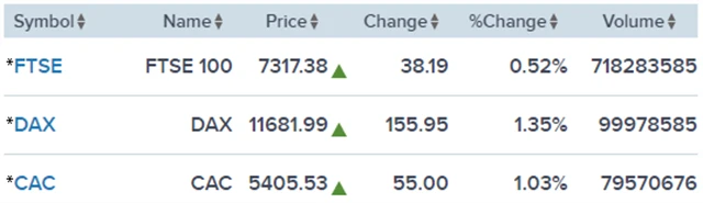 Regionální index STOXX Europe 600 vzrostl o 1,21 % na 383,67 bodu, britský FTSE 100 se zvýšil o 0,52 % na 7 317,38 bodu, francouzský CAC 40 si připsal 1,03 % na 5 405,53 bodu a německý DAX získal 1,35 % na 11 681,99 bodu.