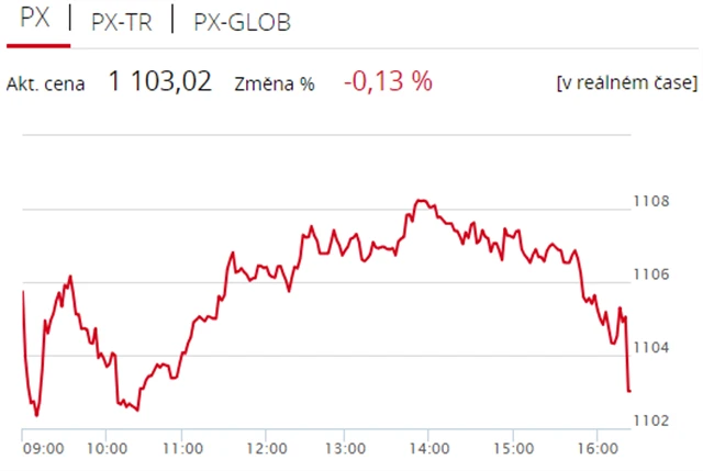 Pražská burza zahájila nový týden v červených číslech, když index PX odepsal 0,13 % na 1 103,02 bodu. Dolů burzu stáhly zejména akcie elektrárenské společnosti ČEZ (-1,28 %), dařilo se naopak telefonnímu operátorovi O2 Czech Republic (+0,61 %). Zobchodovaný objem byl s 538 miliony korun průměrný.