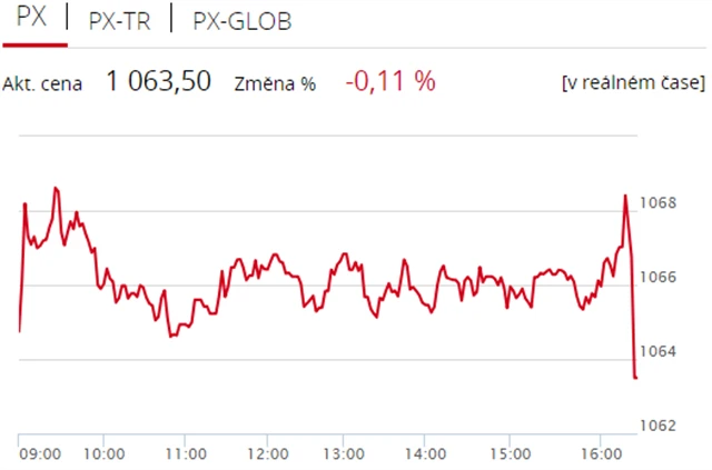Pražská burza v úterý uzavřela s mírnou ztrátou, index PX odepsal 0,11 % na 1 063,5 bodu. Nedařilo se zejména akciím likérky Stock Spirits, které zlevnily o 1,76 %, v plusu naopak uzavřela většina finančních titulů. Objem obchodů byl s 540 miliony korun průměrný.