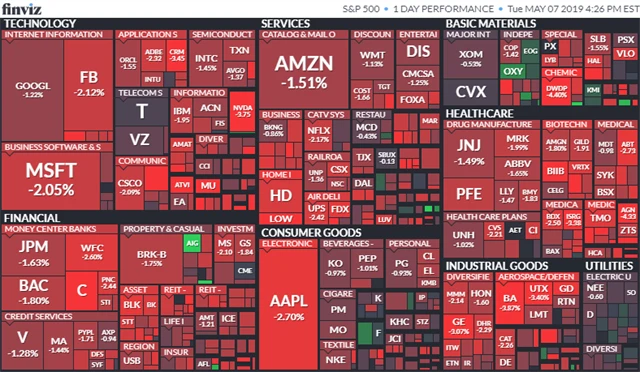 Ztrátu v úterý vykázalo všech jedenáct sektorů indexu S&P 500. Akcie společnosti Boeing, která je největším americkým vývozcem do Číny, ztratily zhruba čtyři procenta. Akcie firmy Caterpillar, citlivé na vývoj obchodu s Čínou, ztratily přes dvě procenta. V mínusu skončily i akcie firem Microsoft (-2,05 %) a Apple (-2,70 %).