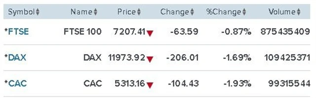 Celoevropský akciový index STOXX Europe 600 uzavřel seanci se ztrátou 1,65 procenta; hluboko v červené zóně končily i všechny sektory a velké trhy. Hlavní index londýnské burzy FTSE 100 odepsal 0,87 procenta, německý DAX poklesl o 1,69 procenta a francouzský CAC 40 si pohoršil o 1,93 procenta.