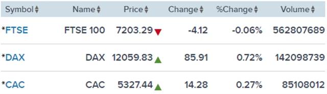 Regionální index STOXX Europe 600 zpevnil o 0,32 % na 377,14 bodu, za celý týden však spadl o více než 3 %. Proti trendu šel britský FTSE 100, který odepsal 0,06 % na 7 203,29 bodu (týden: -2,4 %). Francouzský CAC 40 získal 0,27 % na 5 327,44 bodu (týden -3,99 %) a německý DAX se zvýšil o 0,72 % na 12 059,83 bodu (týden: -2,84 %).