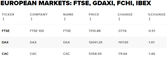 Regionální index STOXX Europe 600 odevzdal 1,06 % na 377,46 bodu, britský FTSE 100 klesl o 0,51 % na 7 310,88 bodu, francouzský CAC 40 přišel o 1,46 % na 5 358,59 bodu a německý DAX se snížil o 1,61 % na 12 041,29 bodu.