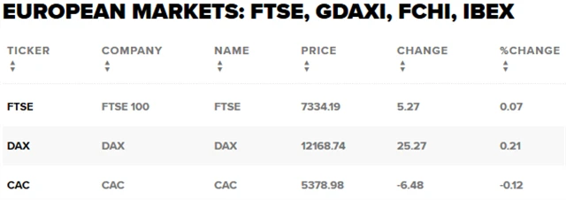 Regionální index STOXX Europe přišel o 0,08 % na 379,19 bodu, britský FTSE 100 zpevnil o 0,07 % na 7 334,19 bodu, francouzský CAC 40 klesl o 0,12 % na 5 378,98 bodu a německý DAX získal 0,21 % na 12 168,74 bodu.