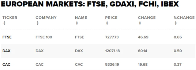 Regionální index STOXX Europe 600 získal 0,22 % na 376,71 bodu, francouzský CAC 40 zpevnil o 0,37 % na 5 336,19 bodu, německý DAX se zvýšil o 0,5 % na 12 071,18 bodu a italský FTSE MIB odepsal 0,06 % na 20 363,13 bodu. Ve Spojeném království se v pondělí kvůli státnímu svátku neobchodovalo.