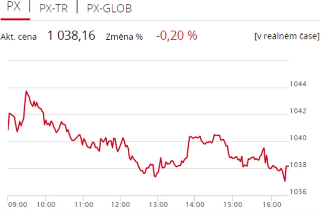Pražská burza zakončila úterní obchodování v negativním pásmu, index PX oslabil o 0,2 % na 1 038,16 bodu. Dolů burzu stáhly zejména akcie Monety Money Bank a společnosti Philip Morris ČR, proti trendu naopak šly cenné papíry antivirové firmy Avast a mediální CME. Zobchodovaný objem činil zhruba 1,5 miliardy korun, a byl tak výrazně nadprůměrný.