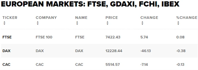 Regionální index STOXX Europe 600 klesl o 0,1 % na 383,4 bodu, britský FTSE 100 zpevnil o 0,08 % na 7 422,43 bodu, francouzský CAC 40 ztratil 0,13 % na 5 514,57 bodu a německý DAX spadl o 0,38 % na 12 228,44 bodu.