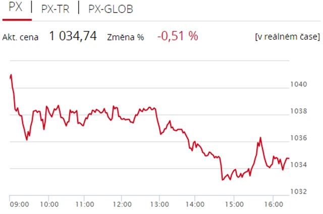Pražská burza ve středu uzavřela v minusu, index PX odevzdal 0,51 % na 1 034,74 bodu. Do červených čísel burzu stáhly zejména akcie Komerční banky (-1,34 % na 886 Kč) a telefonního operátora O2 Czech Republic (-1,35 % na 219 Kč). Dařilo se naopak Erste Group Bank (+0,78 % na 805,20 Kč) a mediální společnosti CME (+1,18 % na 94,50 Kč). Objem obchodů byl s necelými 357 miliony korun výrazně podprůměrný.