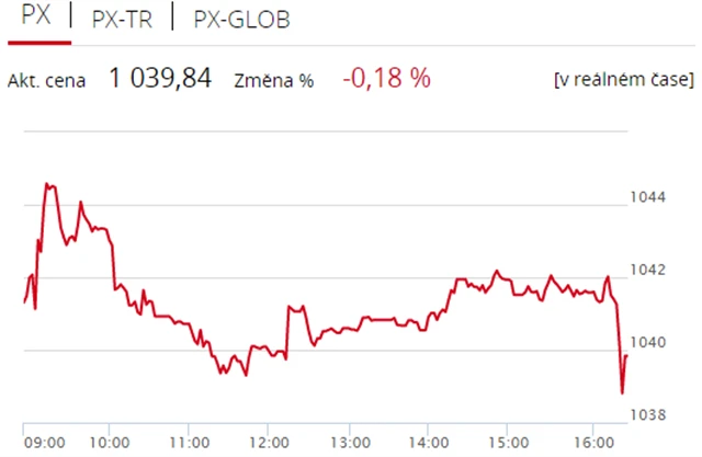 Pražská burza zakončila pondělní obchodování v červených číslech, index PX oslabil o 0,18 % na 1 039,84 bodu. Dolů burzu stáhly zejména akcie elektrárenské skupiny ČEZ (-3,15 % na 523 Kč), s kterými se obchodovalo poprvé bez práva na dividendu z loňského roku v hrubé výši 24 Kč na akcii. Index PX-TR, který je očištěný o dividendy, vzrostl o 0,72 % na 1 955,48 bodu. Zobchodovaný objem činil 276 milionů korun, a byl tak podprůměrný.
