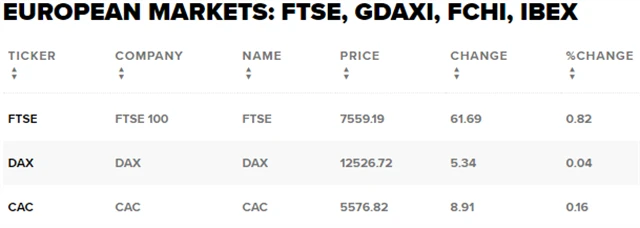 Regionální index STOXX Europe 600 si připsal 0,37 % na 389,29 bodu, britský FTSE 100 stoupl o 0,82 % na 7 559,19 bodu, francouzský CAC 40 posílil o 0,16 % na 5 576,82 bodu a německý DAX vzrostl o 0,04 % na 12 526,72 bodu.