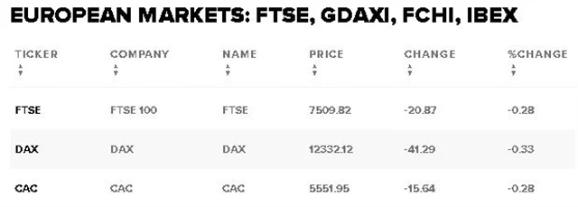 Celoevropský akciový index STOXX Europe 600 odepsal 0,12 procenta. Hlavní index londýnské burzy FTSE 100 si pohoršil o 0,28 procenta, stejně jako francouzský CAC 50; německý DAX odepsal 0,33 procenta.