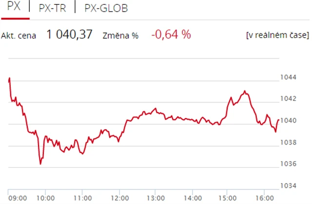 Pražská burza v pátek počtvrté v řadě oslabila, index PX odevzdal 0,64 % na 1 040,37 bodu. Dolů burzu stáhly zejména akcie Monety Money Bank, které zlevnily o 1,27 % na 77,80 Kč. V plusu z hlavních titulů uzavřely pouze nápojářská skupina Kofola ČeskoSlovensko (+1,97 % na 310 Kč) a telekomunikační firma O2 Czech Republic (+1,38 % na 220,50 Kč), jež v pátek reportovala výsledky hospodaření.