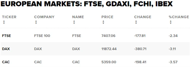 Regionální index STOXX Europe 600 klesl o 2,46 % na 378,15 bodu, za celý týden pak oslabil o 3,22 %. Britský FTSE 100 přišel o 2,34 % na 7 407,06 bodu (týden: -1,88 %), francouzský CAC 40 spadl o 3,57 % na 5 359 bodů (týden: -4,47 %) a německý DAX odevzdal 3,11 % na 11 872,44 bodu (týden: -4,41 %).