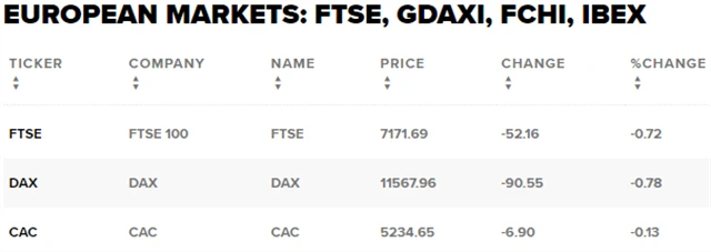 Regionální index STOXX Europe 600 odevzdal 0,47 % na 367,71 bodu, britský FTSE 100 se snížil o 0,72 % na 7 171,69 bodu, francouzský CAC 40 klesl o 0,13 % na 5 234,65 bodu a německý DAX přišel o 0,78 % na 11 567,96 bodu.