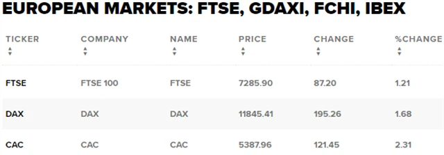 Regionální index STOXX Europe 600 vzrostl o 1,66 % na 374,71 bodu, britský FTSE 100 se zvýšil o 1,21 % na 7 285,9 bodu, francouzský CAC 40 stoupl o 2,31 % na 5 387,96 bodu a německý DAX si připsal 1,68 % na 11 845,41 bodu.