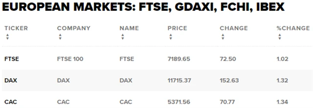 Regionální index STOXX Europe 600 vzrostl o 1,14 % na 373,86 bodu, britský FTSE 100 se zvýšil o 1,02 % na 7 189,65 bodu, francouzský CAC 40 si polepšil o 1,34 % na 5 371,56 bodu a německý DAX posílil o 1,32 % na 11 715,37 bodu.