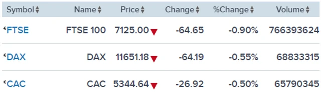 Regionální index STOXX Europe 600 odepsal 0,68 % na 371,3 bodu, britský FTSE 100 přišel o 0,9 % na 7 125 bodů, francouzský CAC 40 se snížil o 0,5 % na 5 344,64 bodu a německý DAX ztratil 0,55 % na 11 651,18 bodu.