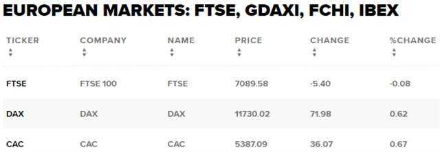 Regionální index STOXX Europe 600 si polepšil o 0,63 % na 373,62 bodu, britský FTSE 100 po pondělním volnu odepsal 0,08 % na 7 089,58 bodu, francouzský CAC 40 získal 0,67 % na 5 387,09 bodu a německý DAX se zvýšil o 0,62 % na 11 730,02 bodu.