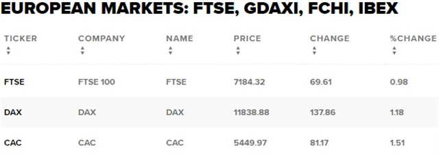 Regionální index STOXX Europe 600 vzrostl o 1,04 % na 376,74 bodu, britský FTSE 100 si polepšil o 0,98 % na 7 184,32 bodu, francouzský CAC 40 se zvýšil o 1,51 % na 5 449,97 bodu a německý DAX posílil o 1,18 % na 11 838,88 bodu.