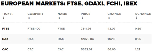 Regionální index STOXX Europe 600 stoupl o 0,9 % na 383,23 bodu, britský FTSE 100 získal 0,59 % na 7 311,26 bodu, francouzský CAC 40 si polepšil o 1,21 % na 5 532,07 bodu a německý DAX se zvýšil o 0,96 % na 12 025,04 bodu.