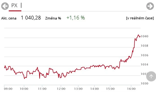 Index pražské burzy PX si během čtvrtečního obchodování připsal 1,16 % a uzavřel seanci na hodnotě 1 040,28 bodu. Nejúspěšnějšími tituly byly softwarový vývojář Avast, Erste Group Bank a energetická skupina ČEZ. Jejich zisky převážily nad ztrátami šesti ze třinácti hlavních emisí v čele s nejobchodovanějším titulem dne, Komerční bankou. Zobchodovaný objem čítal necelých 266 milionů korun.