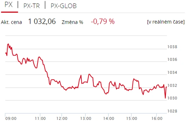 Pražská burza zakončila páteční obchodování v červených číslech, index PX odepsal 0,79 % na 1 032,06 bodu. Dolů burzu stáhly zejména akcie Komerční banky, které zlevnily o 1,91 % na 821 Kč. Objem obchodů byl s 307 miliony korun podprůměrný.