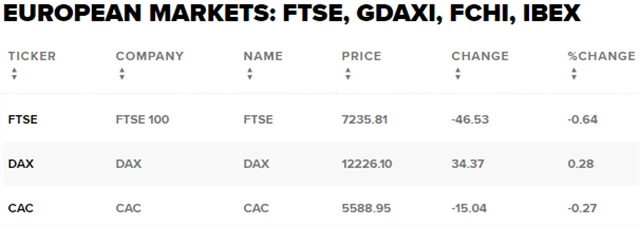 Regionální index STOXX Europe 600 odepsal 0,28 % na 386,06 bodu, britský FTSE 100 ztratil 0,64 % na 7 235,81 bodu, francouzský CAC 40 oslabil o 0,27 % na 5 588,95 bodu a německý DAX zpevnil o 0,28 % na 12 226,1 bodu.