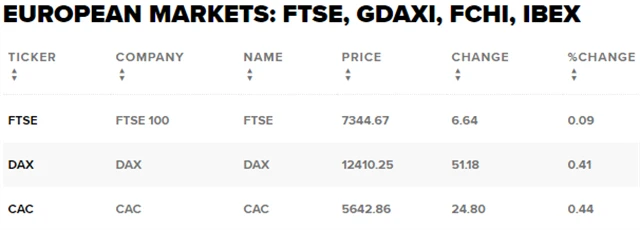 Regionální index STOXX stoupl o 0,2 % na 390,48 bodu, britský FTSE 100 zpevnil o 0,09 % na 7 344,67 bodu, francouzský CAC 40 si polepšil o 0,44 % na 5 642,86 bodu a německý DAX vzrostl o 0,41 % na 12 410,25 bodu.