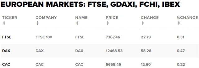 Regionální index STOXX Europe 600 posílil o 0,34 % na 391,79 bodu, za celý týden pak získal 1,2 %. Britský FTSE 100 si polepšil o 0,31 % na 7 367,46 bodu (týden: +1,17 %), francouzský CAC 40 stoupl o 0,22 % na 5 655,46 bodu (týden: +0,92 %) a německý DAX se zvýšil o 0,47 % na 12 468,53 bodu (týden: +2,27 %).