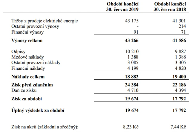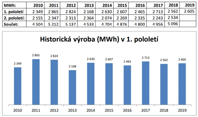Dva fotovoltaické parky, které společnost ovládá, vyrobily v prvních šesti měsících roku 2,605 GWh elektrické energie. To značí meziroční nárůst výroby zhruba o 1,7 %. "Jedná se výrobu, která odpovídá dlouhodobému průměru v tomto období. Za červenec a srpen 2019 bylo vyrobeno 1,228 GWh, což je též výroba, která odpovídá dlouhodobému normálu (1,272 GWh ve stejném období minulého roku). Jedná se tedy o standardní průběh," uvádí společnost ve výsledkové zprávě.