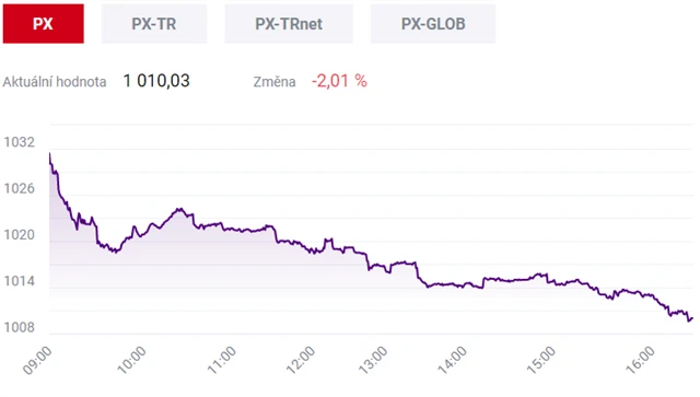 Pražská burza ve středu uzavřela hluboko v minusu, index PX ztratil 2,01 % na 1 010,03 bodu. Dolů burzu stáhly zejména akcie Komerční banky (-3,1 % na 765,50 Kč) a Erste Group Bank (-2,46 % na 752 Kč). Objem obchodů byl s 573 miliony korun mírně nadprůměrný.
