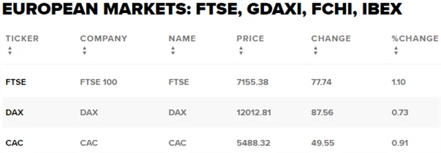 Regionální index STOXX Europe 600 stoupl o 0,73 % na 380,22 bodu, za celý týden ale oslabil o 2,95 %. Britský FTSE 100 si připsal 1,1 % na 7 155,38 bodu (týden: -3,65 %), francouzský CAC 40 vzrostl o 0,91 % na 5 488,32 bodu (týden: -2,7 %) a německý DAX získal 0,73 % na 12 012,81 bodu (týden: -2,24 %).