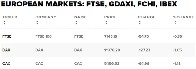 Regionální index STOXX Europe 600 odevzdal 1,1 % na 378,71 bodu, britský FTSE 100 přišel o 0,76 % na 7 143,15 bodu, francouzský CAC 40 oslabil o 1,18 % na 5 456,62 bodu a německý DAX ztratil 1,05 % na 11 970,2 bodu.