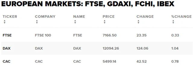 Regionální index STOXX Europe 600 posílil o 0,32 % na 379,92 bodu, britský FTSE 100 získal 0,33 % na 7 166,5 bodu, francouzský CAC 40 vzrostl o 0,78 % na 5 499,14 bodu a německý DAX se zvýšil o 1,04 % na 12 094,26 bodu.