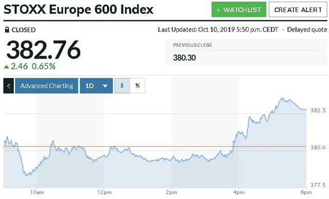 Celoevropský akciový index STOXX Europe 600 uzavřel se ziskem 0,8 %, když jeho vzestup vedly automobilky a základní suroviny, tedy sektory citlivé na vývoj v oblasti světového obchodu. V černých číslech skončily i hlavní západoevropské trhy. Hlavní index londýnské burzy FTSE 100 si připsal 0,28 %, německý DAX stoupl o 0,58 % a francouzský CAC 40 si polepšil o 1,27 %.