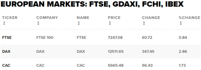 Regionální index STOXX Europe 600 stoupl o 2,31 % na 391,61 bodu, za celý týden pak vzrostl o 3 %. Britský FTSE 100 zpevnil o 0,84 % na 7 247,08 bodu (týden: +1,28 %), francouzský CAC 40 si polepšil o 1,73 % na 5 665,48 bodu (týden: +3,23 %) a německý DAX se zvýšil o 2,86 % na 12 511,65 bodu (týden: +4,15 %).