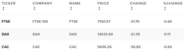 Regionální index STOXX Europe 600 oslabil o 0,32 % na 391,84 bodu, za celý týden ale zpevnil o 0,06 %. Britský FTSE 100 odevzdal 0,44 % na 7 150,57 bodu (týden: -1,33 %), francouzský CAC 40 se snížil o 0,65 % na 5 636,25 bodu (týden: -0,52 %) a německý DAX klesl o 0,17 % na 12 633,6 bodu (týden: +0,97 %).