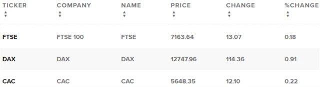 Regionální index STOXX Europe 600 si připsal 0,61 % na 394,22 bodu, britský FTSE 100 vzrostl o 0,18 % na 7 163,64 bodu, francouzský CAC 40 se zvýšil o 0,22 % na 5 648,35 bodu a německý DAX si polepšil o 0,91 % na 12 747,96 bodu.