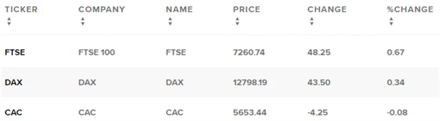 Regionální index STOXX Europe 600 stoupl o 0,11 % na 395,03 bodu, britský FTSE 100 získal 0,67 % na 7 260,74 bodu, francouzský CAC 40 odepsal 0,08 % na 5 653,44 bodu a německý DAX vzrostl o 0,34 % na 12 798,19 bodu.